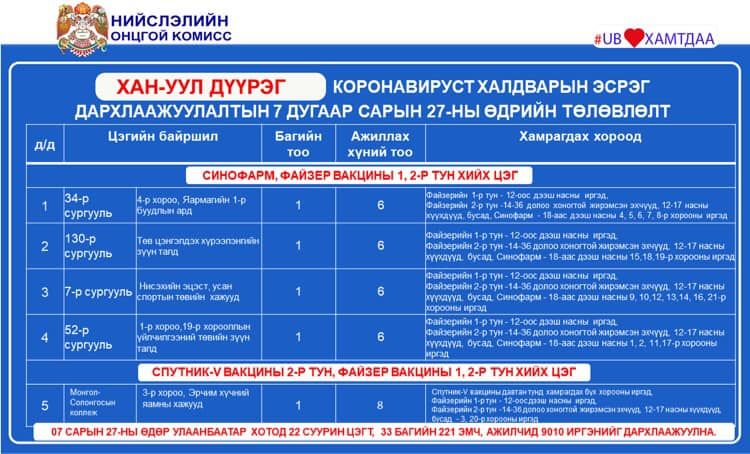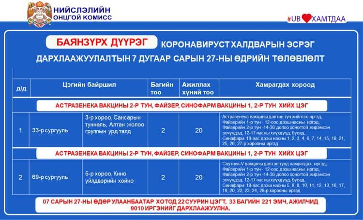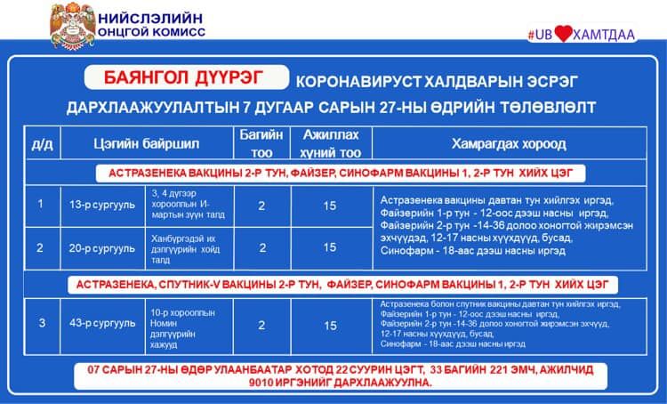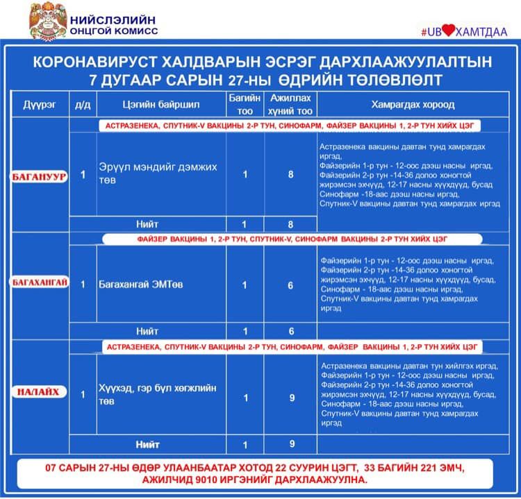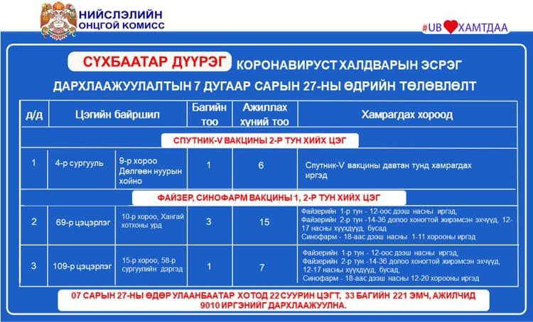 Улаанбаатар хотод өнөөдөр буюу долдугаар сарын 27-нд коронавирусийн эсрэг вакцинжуулалтын суурин 22 цэгт ажиллана. Суурин 22 цэгт 33 багийн 221 эмч, ажилтан ажиллаж, 9010 иргэнийг дархлаажуулахаар төлөвлөжээ.