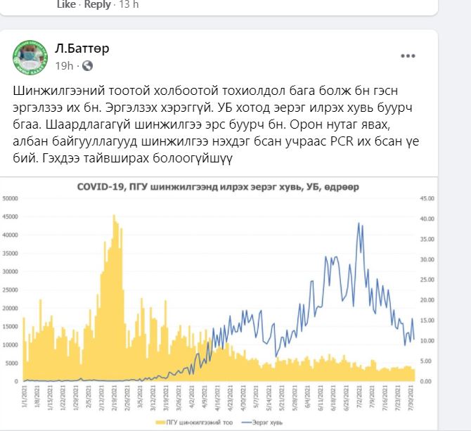 Ийн нийслэлд халдвар авсан иргэдийн тоо буурсан нь шинжилгээ өгөх хүний тоо багассантай холбоотой хэмээн иргэд шүүмжилж буй. Энэ талаар ХӨСҮТ-ийн захирал Л.Баттөр цахим хуудастаа тайлбар хийжээ. Тэрбээр “Шинжилгээний тоотой холбоотой тохиолдол бага болж байна гэсэн эргэлзээ их байна. Эргэлзэх хэрэггүй. Улаанбаатар хотод эерэг илрэх хувь буурч байгаа. Шаардлагагүй шинжилгээ эрс буурч байна. Орон нутаг явах, албан байгууллагууд шинжилгээ нэхдэг байсан учраас PCR их байсан үе бий. Гэхдээ тайвшрах болоогүй шүү” гэжээ.