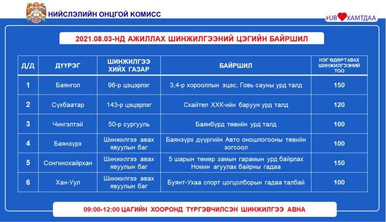 Харин коронавирусийн халдвар илрүүлсэн PCR шинжилгээний зургаан цэг ажиллаж байгаа бөгөөд 09:00-12:00 цагийн хооронд ажиллах юм.