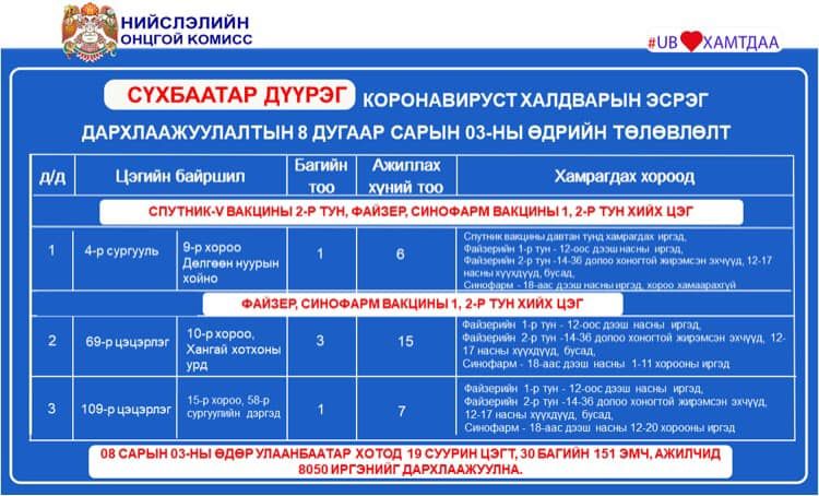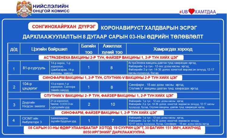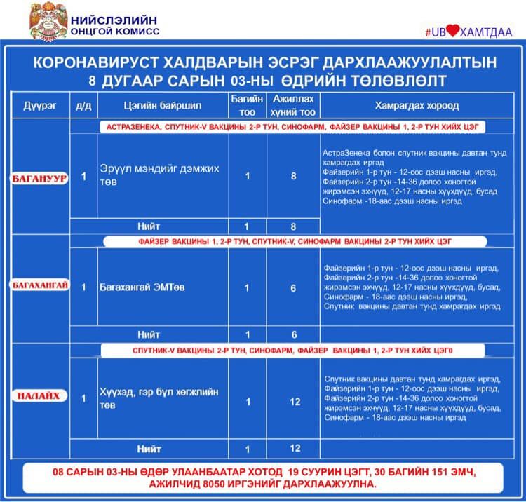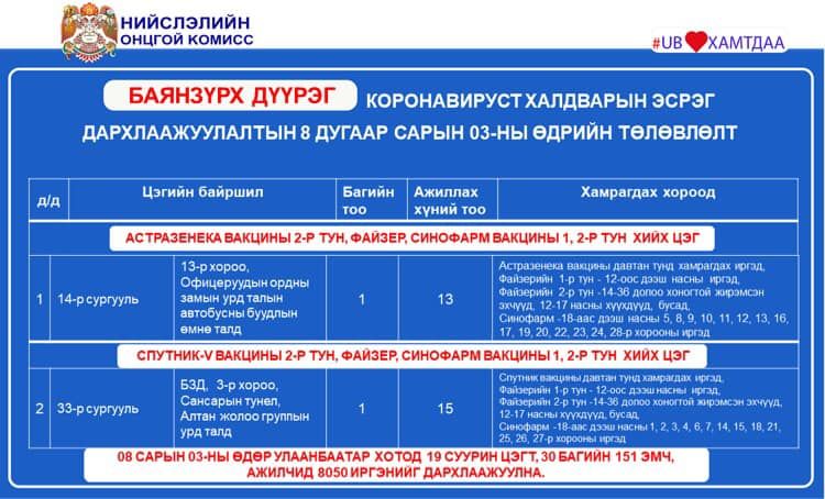 Улаанбаатар хотод өнөөдөр буюу наймдугаар сарын 3-ны өдөр суурин 19 цэгт 30 багийн 151 эмч, ажиллаж, 8050 иргэнийг вакцинжуулалтад хамруулахаар төлөвлөжээ.