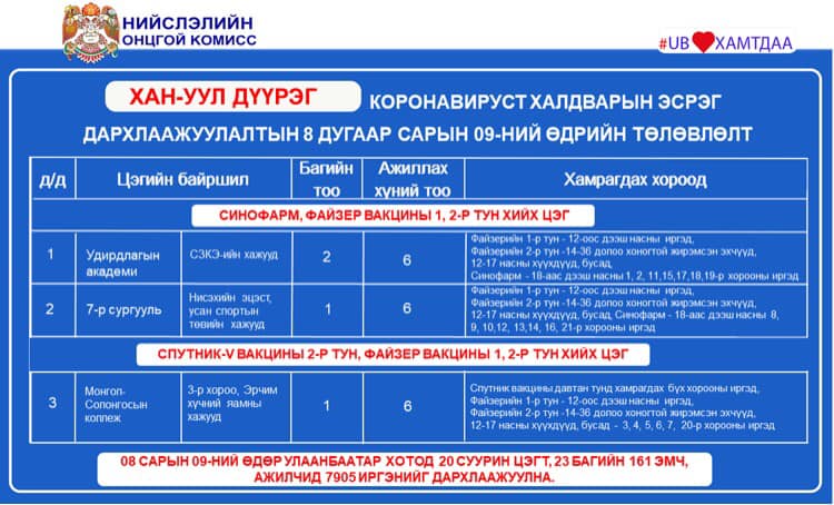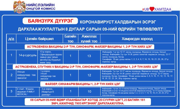 Улаанбаатар хотод өнөөдөр буюу наймдугаар сарын 9-нд коронавирусийн эсрэг вакцинжуулалтын суурин 20 цэгт 23 багийн 161 эмч, ажилтан ажиллаж, 7905 иргэнийг дархлаажуулахаар төлөвлөжээ.