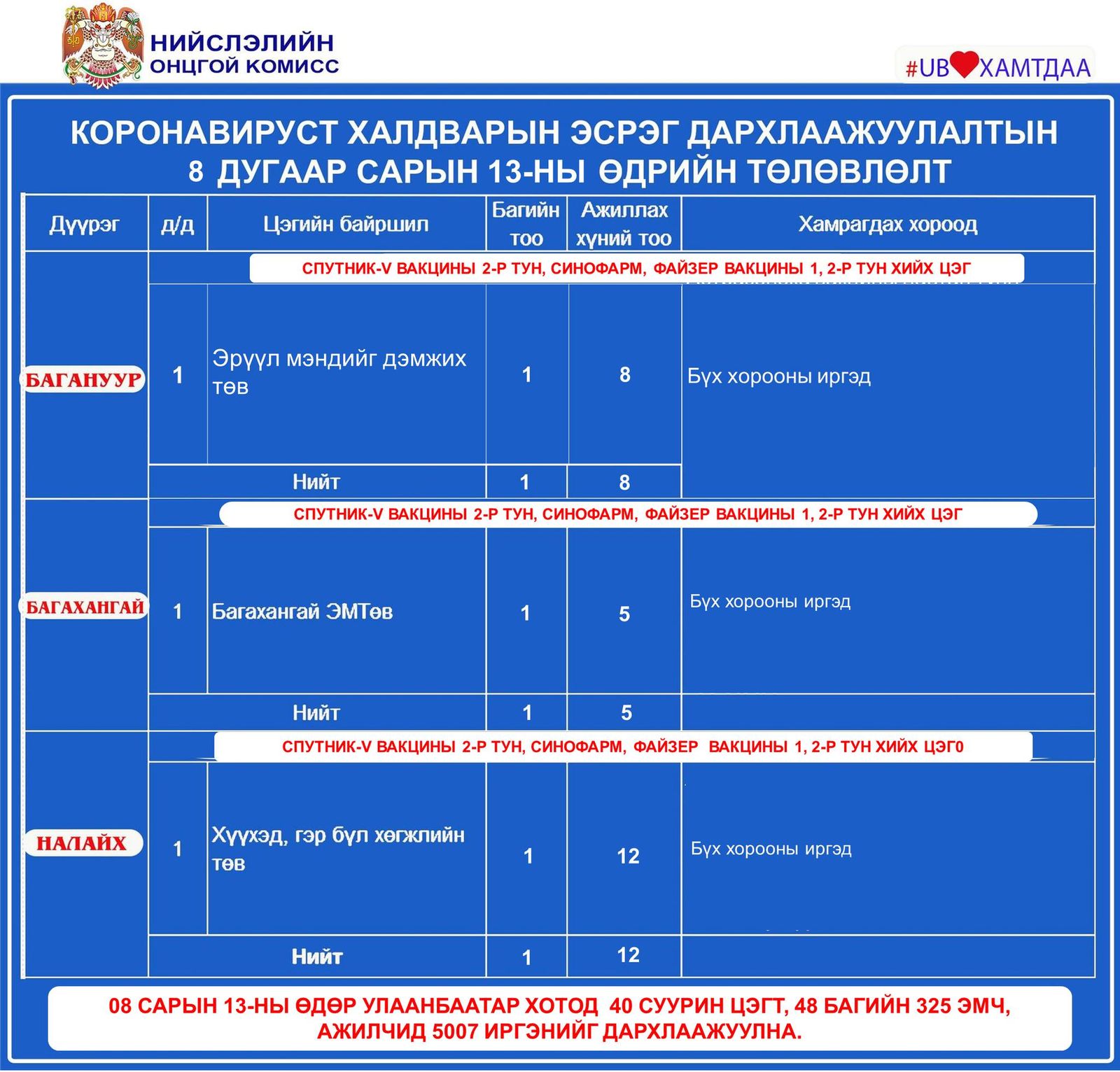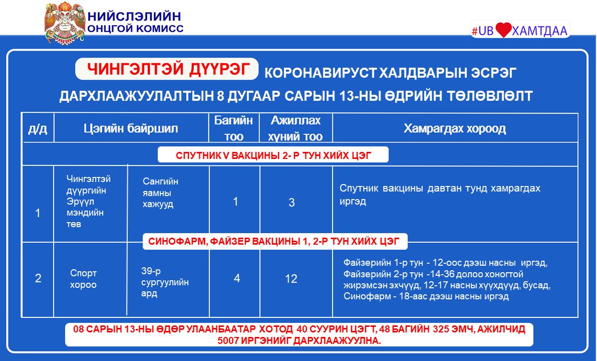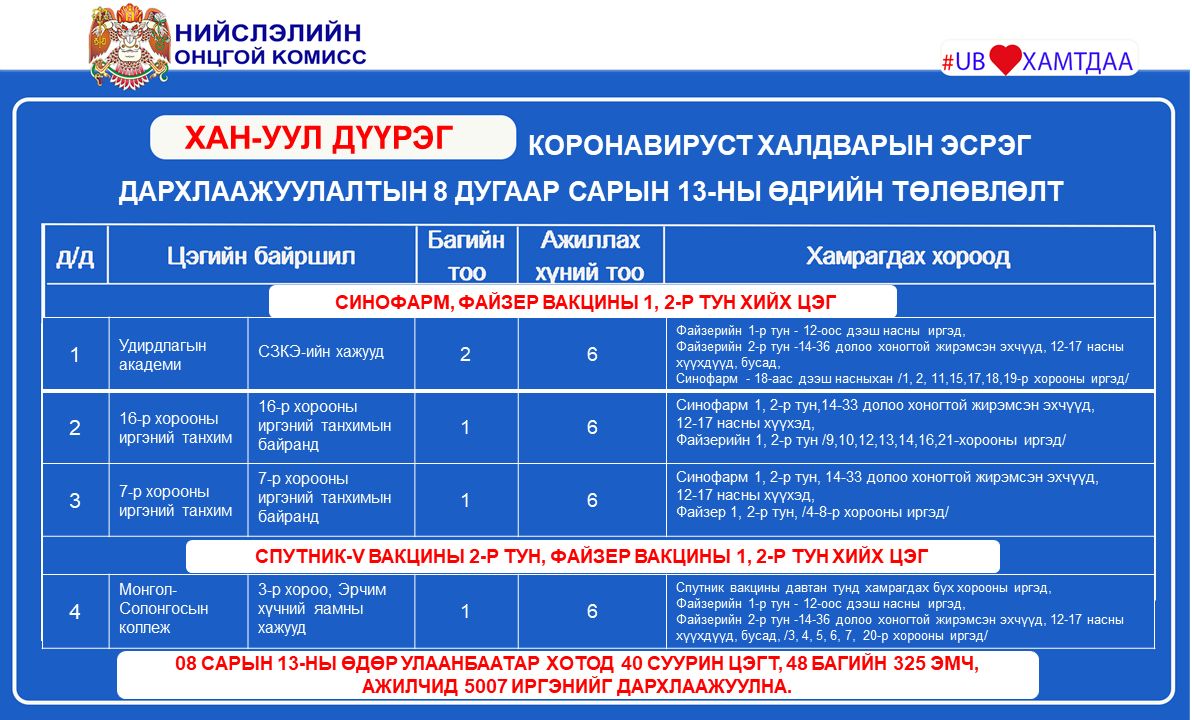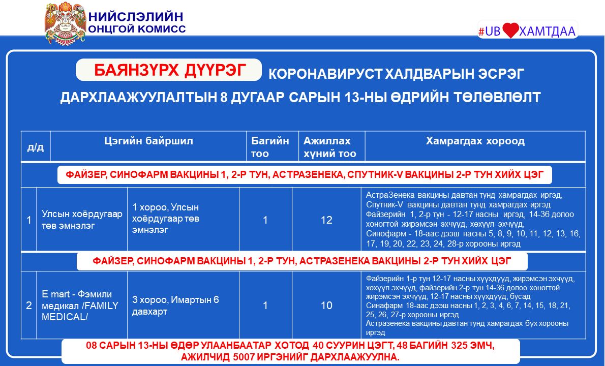 Улаанбаатар хотод өнөөдөр буюу наймдугаар сарын 13-нд коронавирусийн эсрэг вакцинжуулалтын суурин 19 цэг ажиллана. Суурин 19 цэгт 48 багийн 325 эмч, ажилтан ажиллаж, 5007 иргэнийг дархлаажуулахаар төлөвлөжээ.