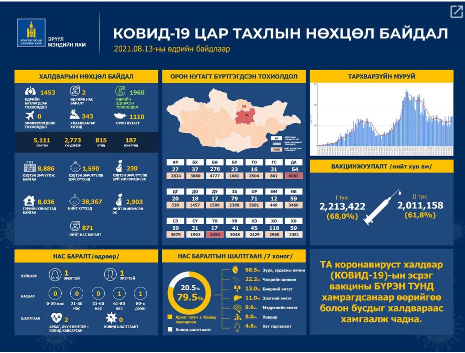 Өнөөдрийн байдлаар эмнэлэгт нийт 8886 хүн хэвтэн эмчлүүлж байгаагаас 1590 нь хүүхэд, 230 нь жирэмсэн эх байна. Улсын хэмжээнд коронавирусийн вакцины нэгдүгээр тунд 2213422, хоёрдугаар тунд 2011158 хүн хамрагдаад байгаа юм.