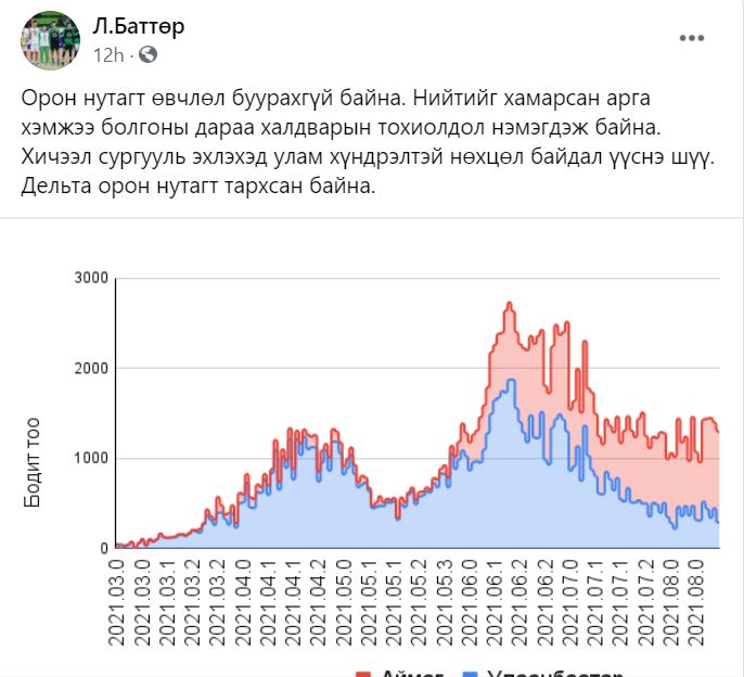Тэгвэл ХӨСҮТ-ийн захирал Л.Баттөр өөрийн орон нутагт дельта хувилбар тархсан талаар мэдээллээ. Тэрбээр “Орон нутагт өвчлөл буурахгүй байна. Нийтийг хамарсан арга хэмжээ болгоны дараа халдварын тохиолдол нэмэгдэж байна. Хичээл сургууль эхлэхэд улам хүндрэлтэй нөхцөл байдал үүснэ шүү. Дельта орон нутагт тархсан байна” хэмээн өөрийн цахим хуудастаа нийтэлжээ.