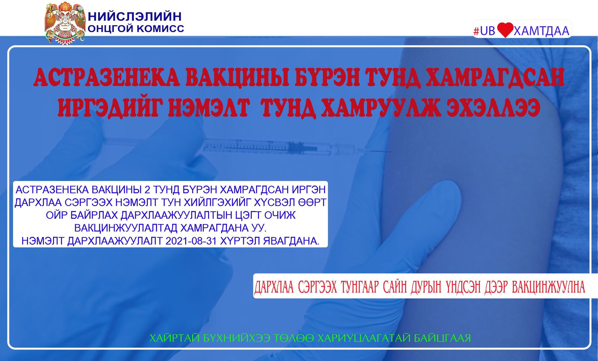 | Астразенека вакцины бүрэн тунд хамрагдсан иргэдэд гурав дахь тун тарьж эхэллээ |