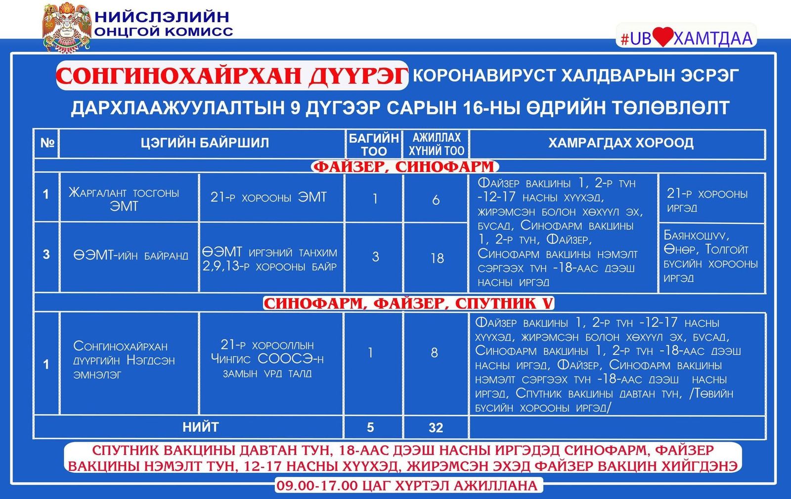 Улаанбаатар хотод өнөөдөр буюу есдүгээр сарын 16-нд коронавирусийн эсрэг дархлаажуулалтын 40 цэг 09:00-17:00 цаг хүртэл ажиллана. Вакцинжуулалтын 40 цэгт нийт 61 багийн 320 эмч, ажилтан ажиллаж, 5,352 иргэнийг дархлаажуулахаар төлөвлөжээ.