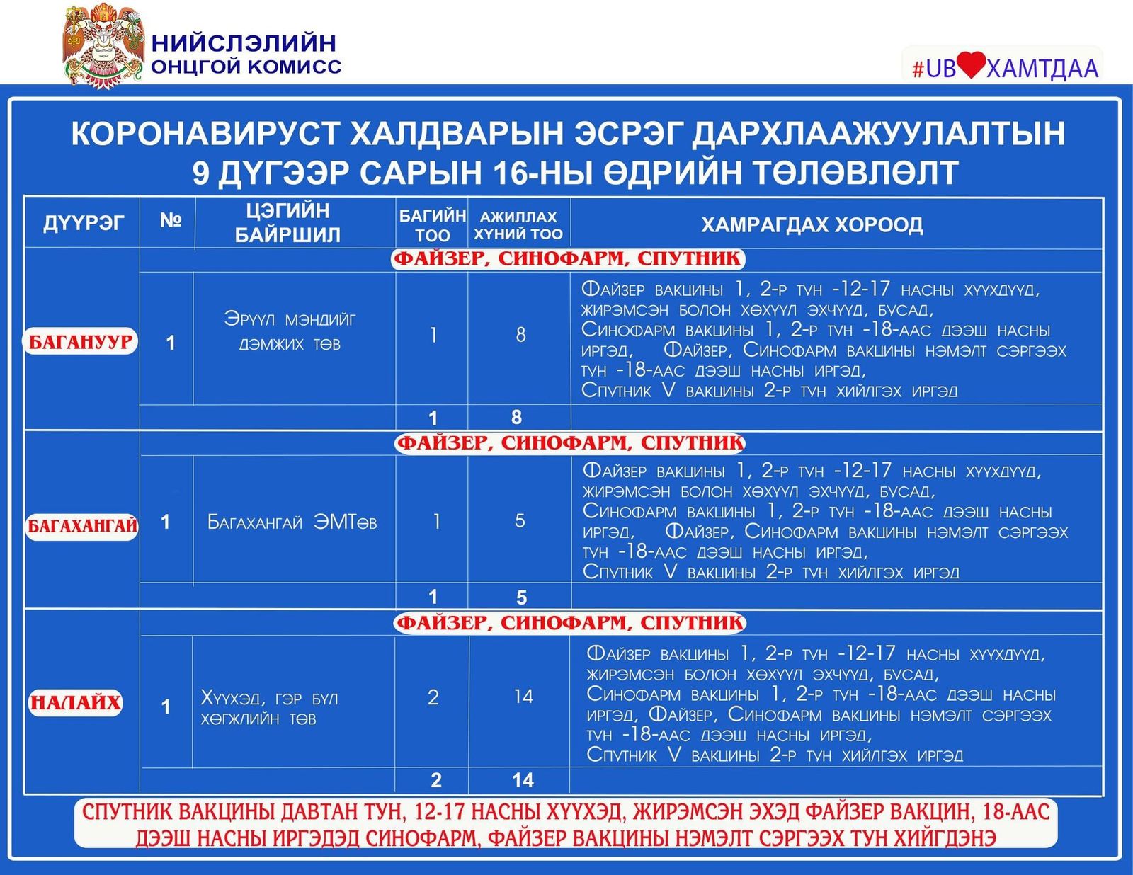 Вакцинжуулалт эхэлснээс хойш нийслэлийн нийт хүн амын I тунгийн хамралт 74.4 хувь, II тунгийн хамралт 70.2 хувь байна. Мөн зорилтот бүлгийн буюу 2847 жирэмсэн эх, 12-15 насны 64552, 16-17 насны 25594 хүүхэд тус тус дархлаажуулалтын бүрэн тунд хамрагдлаа гэж нийслэлийн Онцгой комиссоос мэдээлэв.