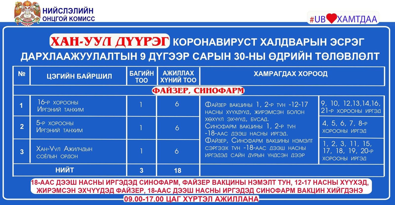 Улаанбаатар хотод өнөөдөр дархлаажуулалтын суурин 24 цэг 09:00-17:00 цаг хүртэл ажиллана. Эдгээр цэгт 33 багийн 185 эмч, ажилтан ажиллаж, 3,068 иргэнийг дархлаажуулахаар төлөвлөжээ.