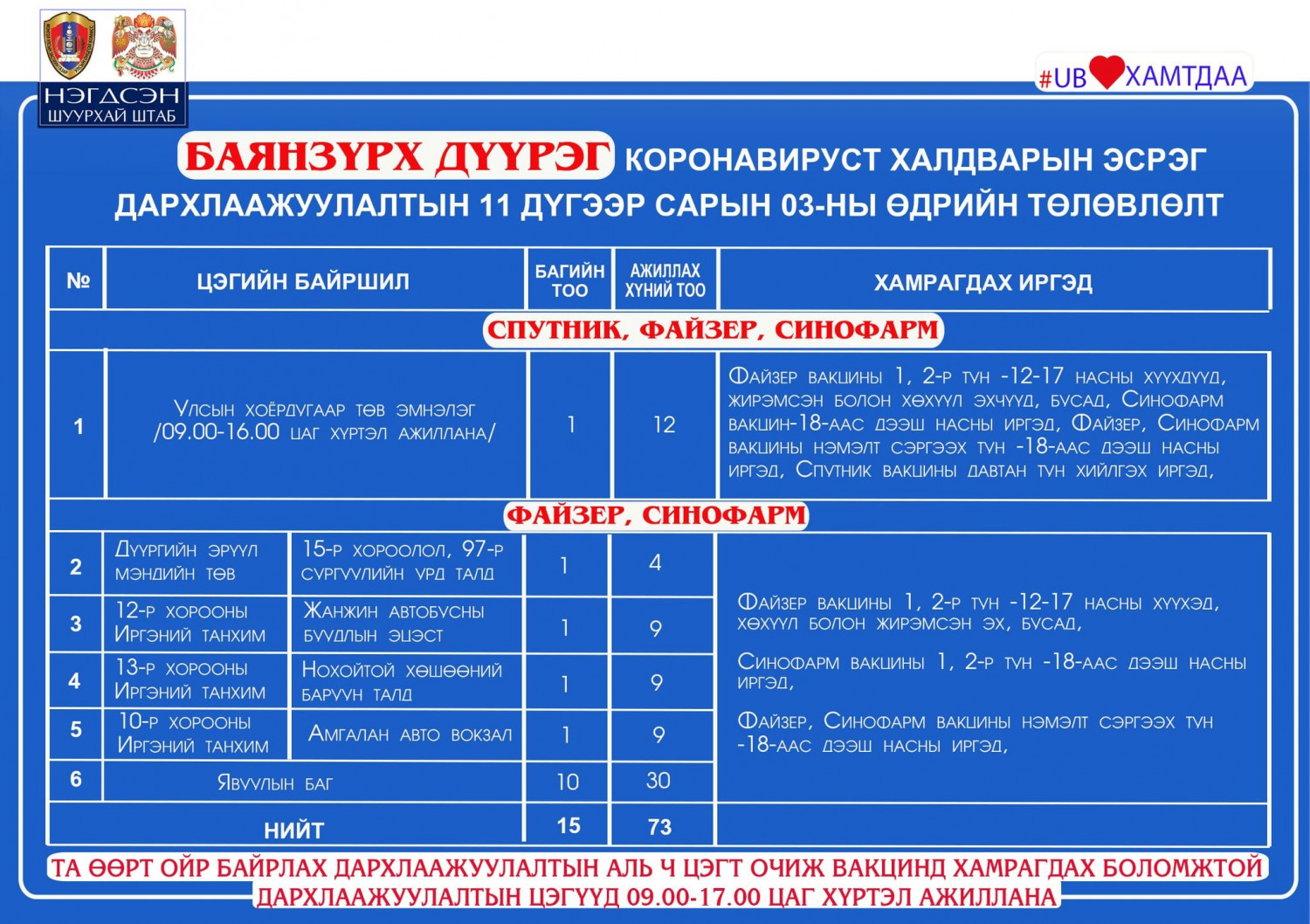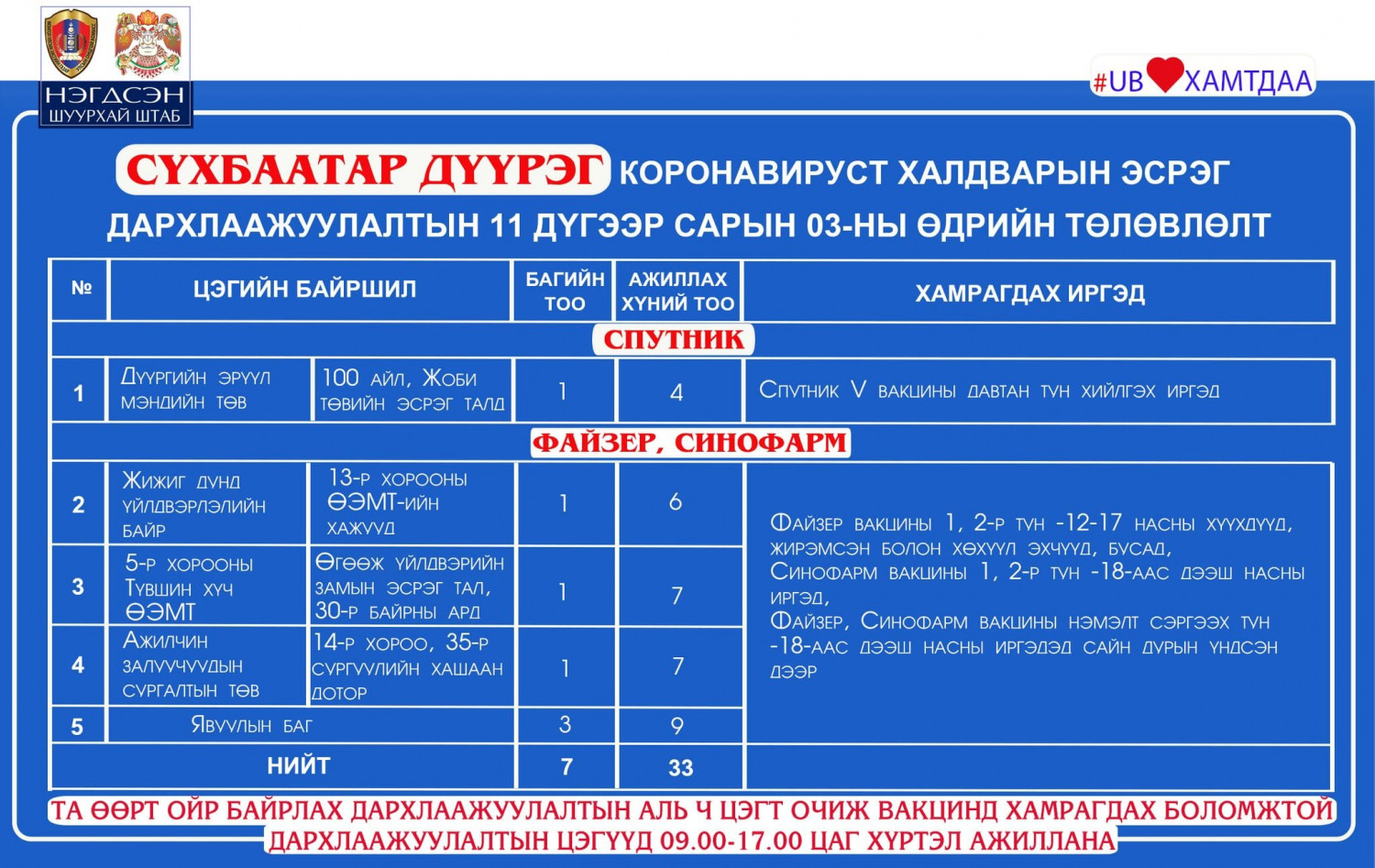Өнөөдөр буюу арваннэгдүгээр сарын 3-нд Улаанбаатар хотод явуулын 43 баг, суурин 41 цэгт, 92 багийн 347 эмч, ажилтан ажиллаж, 5188 иргэнийг дархлаажуулахаар төлөвлөжээ. Дархлаажуулалтын 09:00-17:00 цагийн хүртэл ажиллана.