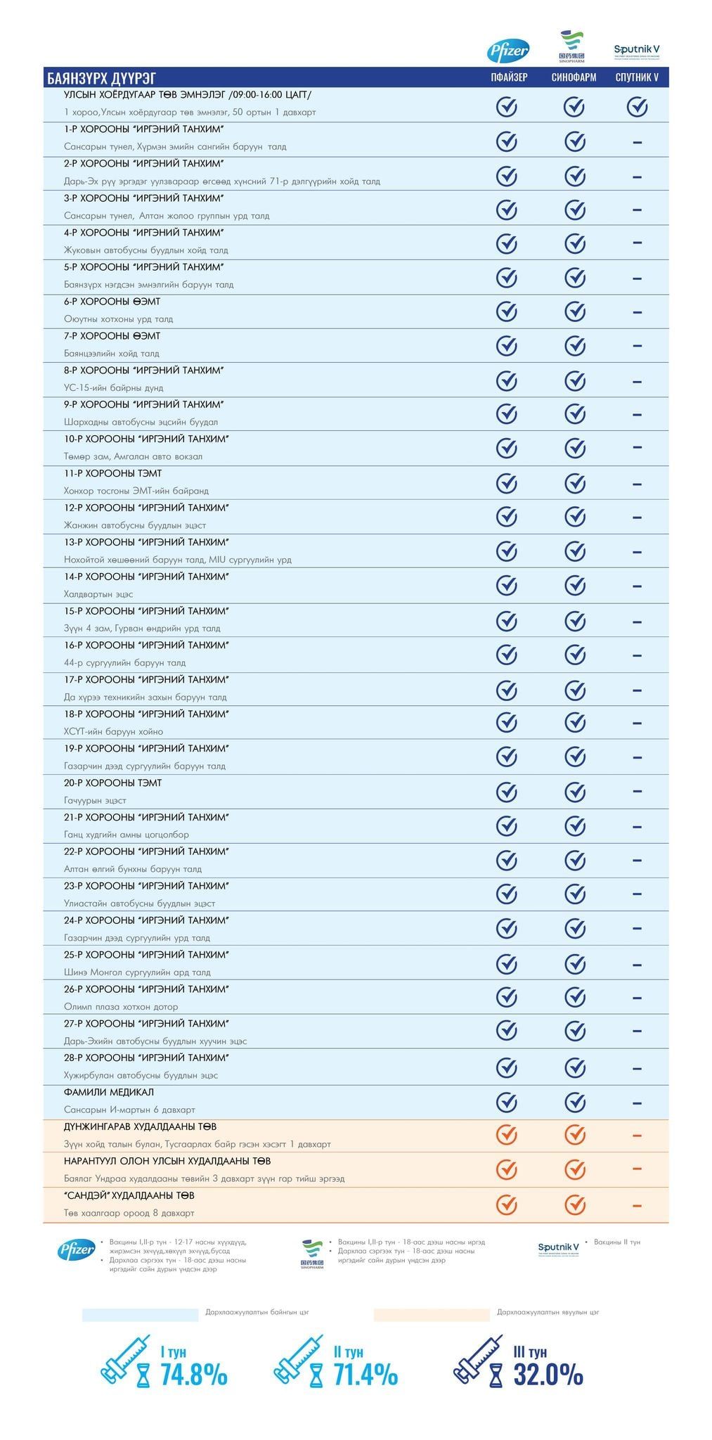 Улаанбаатар хотод өнөөдөр явуулын 37 баг, суурин 173, түр 14 цэг ажиллана. Эдгээрт 224 багийн 1017 эмч, ажилтан ажиллаж, 12.164 иргэнийг дархлаажуулахаар төлөвлөжээ. Вакциныг харьяалал харгалзахгүй хийх тул та өөрт ойр байрлах аль ч цэгт очиж дархлаажуулалтад хамрагдах боломжтой. Дархлаажуулалтын цэгүүд 09:00-20:00 цаг хүртэл ажиллана.