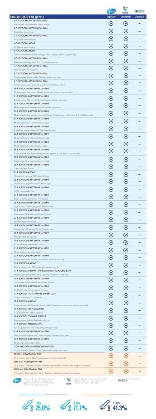 Эдгээрт 188 багийн 867 эмч, ажилтан ажиллаж, 6,000 иргэнийг дархлаажуулахаар төлөвлөлөө. Та өөрт ойр байрлах аль ч цэгт очиж дархлаажуулалтад хамрагдах боломжтой. Нийслэлийн хэмжээнд өчигдөр коронавируст халдвараас сэргийлэх вакцины