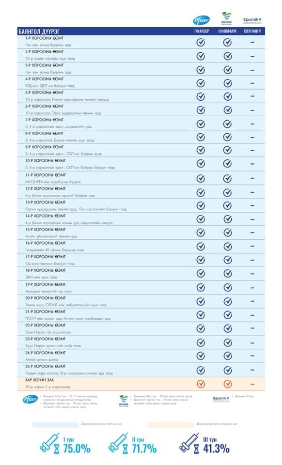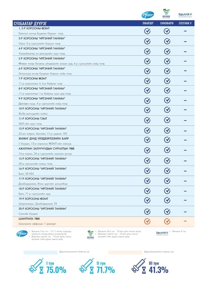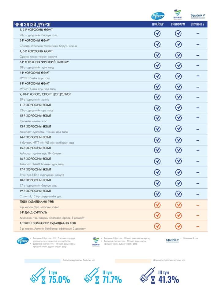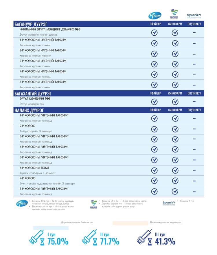 Вакцинжуулалт эхэлснээс хойш нийслэлийн нийт хүн амын I тунгийн хамралт 75 хувь, II тунгийн хамралт 71.7 хувь, нэмэлт тунгийн хамрагдалт 41.5 хувь байна. Мөн 2,987 жирэмсэн эх, 12-15 насны 68,271, 16-17 насны 26,902 хүүхэд тус тус дархлаажуулалтын бүрэн тунд хамрагдлаа.