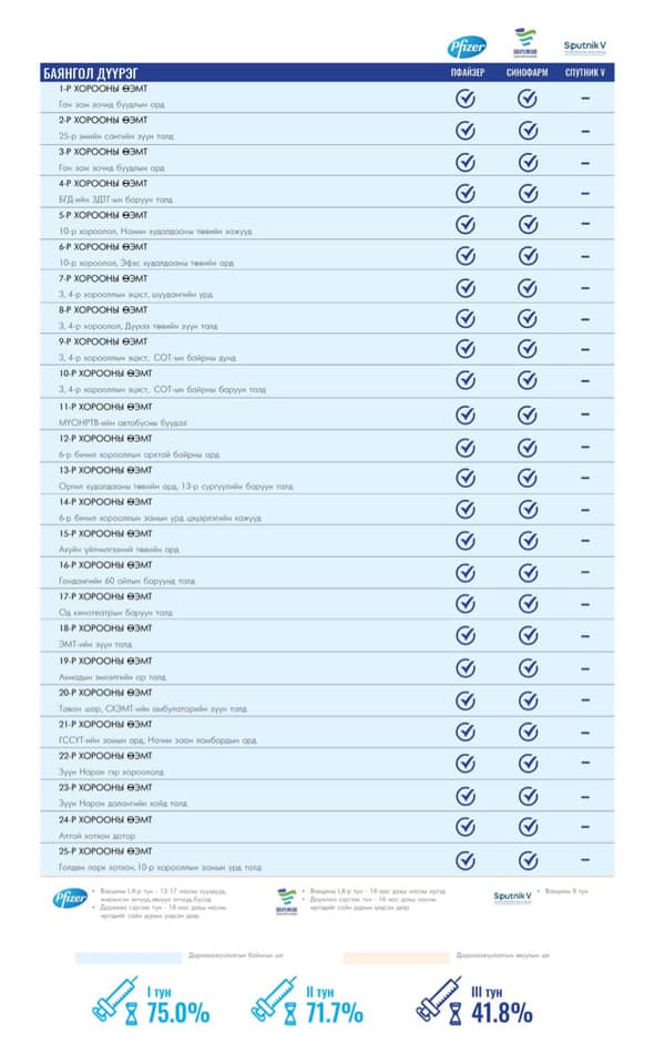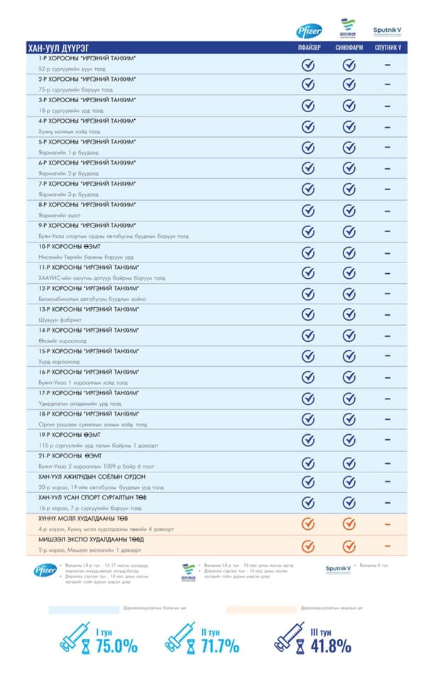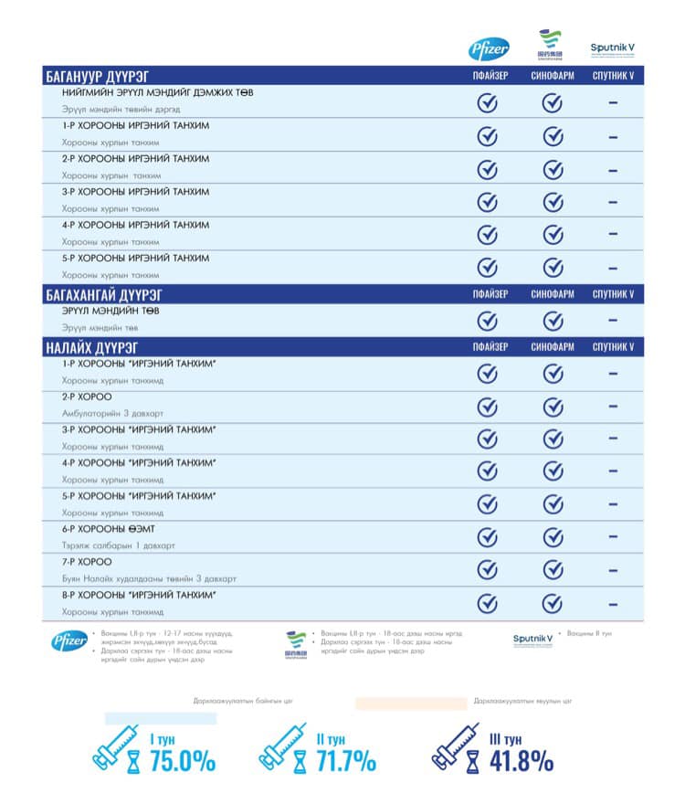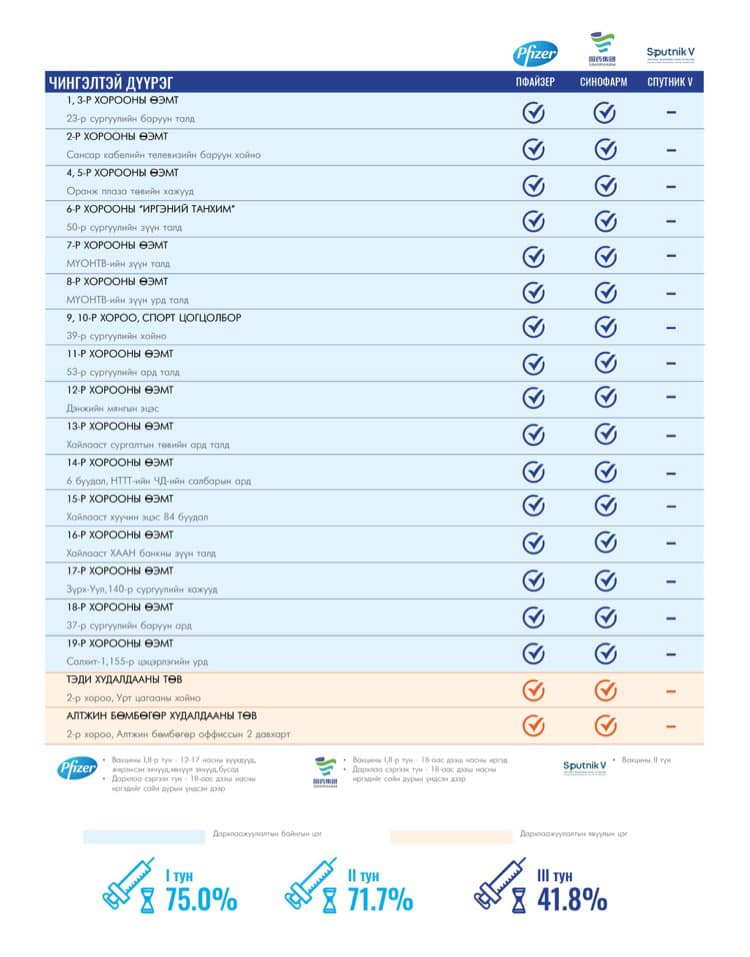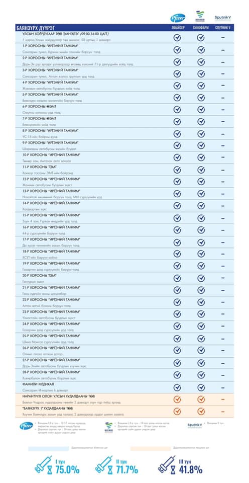Мөн томоохон зах, худалдааны төвд вакцинжуулалтын түр 10 цэг ажиллах юм. Дархлаажуулалтын цэгүүд 09:00-20:00 цагийн хооронд ажиллана.