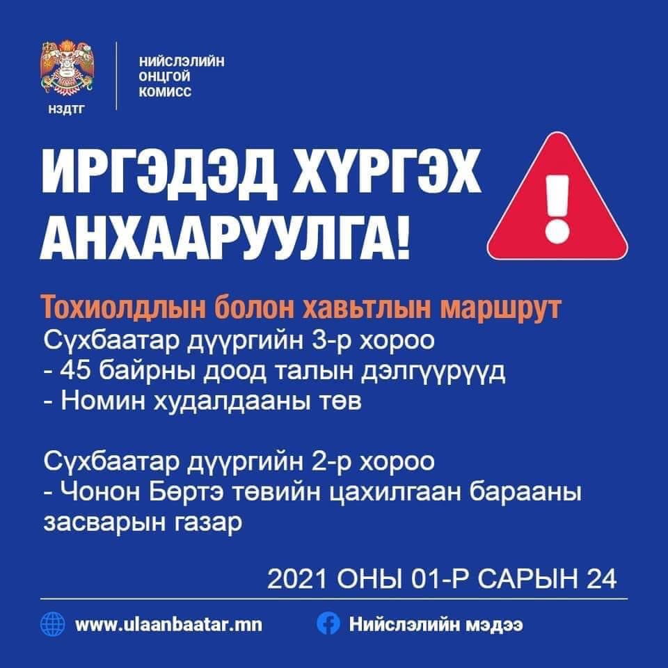 Улаанбаатар хотын хэмжээнд цар тахлын голомтууд бүрэн хумигдаагүй, эрсдэл маш өндөр хэвээр байгаа тул иргэдийг шаардлагагүй тохиолдолд гэрээсээ гарахгүй байхыг уриалж байна.