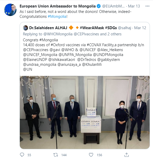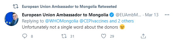 Харин дээр дурдсан арга хэмжээний үеэр хандивын вакцин хүлээж авч байгаатай холбоотойгоор юу ч хэлэхгүй, ямар ч үг дуугарсангүй хэмээн дургүйцлээ илэрхийлсэн байна. Тодруулбал, Европын Холбооноос Монгол Улсад суугаа Төлөөлөгчийн газрын цахим хаягт болон Европын Холбооноос Монгол Улсад суугаа Онц бөгөөд Бүрэн эрхт Элчин сайд Траян Лауренцю Христе өөрийн цахим хаягаараа дамжуулан “Харамсалтай нь хандивын вакцины талаар нэг ч үг дуугарсангүй” хэмээж, Монгол Улсын Засгийн газрын болон Шадар сайд С.Амарсайханы цахим хаягийг нийтлэлдээ дурджээ.