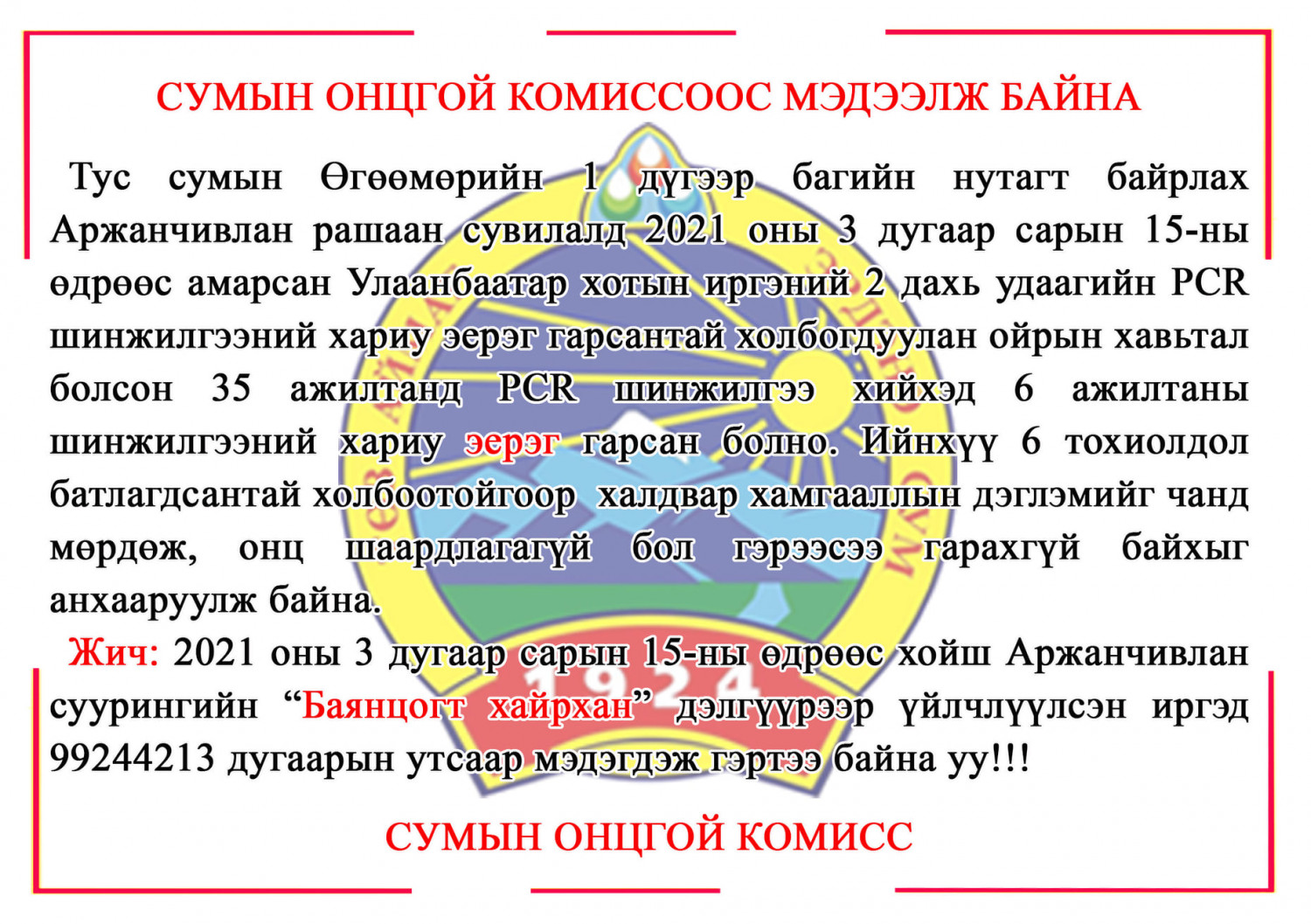 | Аржанчивлан сувиллын зургаан хүнээс халдвар илэрч, Эрдэнэ суманд хөл хорио тогтоолоо |