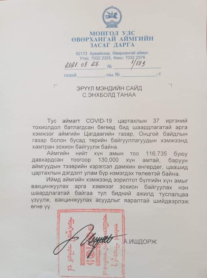 Уг албан бичигт “Өвөрхангай аймагт “Ковид-19” халдварын 37 тохиолдол батлагдсан бөгөөд бид шаардлагатай арга хэмжээг аймгийн Цагдаагийн газар, Онцгой байдлын газар болон бусад төрийн байгууллагуудын хэмжээнд хамтран зохион байгуулж байна. Аймгийн нийт хүн амын тоо 116 мянга 735 буюу давхардсан тоогоор 130 мянган хүн амтай бөгөөд аруун аймгуудын тээврийн хэрэгсэл дамжин өнгөрдөг. Цаашид цар тахлын дэгдэлт улам нэмэгдэх төлөвтэй байна. Иймд аймгийн хэмжээнд зорилтот бүлгийн хүн амыг вакцинжуулах арга хэмжээг зохион байгуулах нэн шаардлагатай байгаа тул бидний ажилд туслалцаа үзүүлж, вакцинжуулах асуудлыг яаралтай шийдвэрлэж өгнө үү” гэжээ.