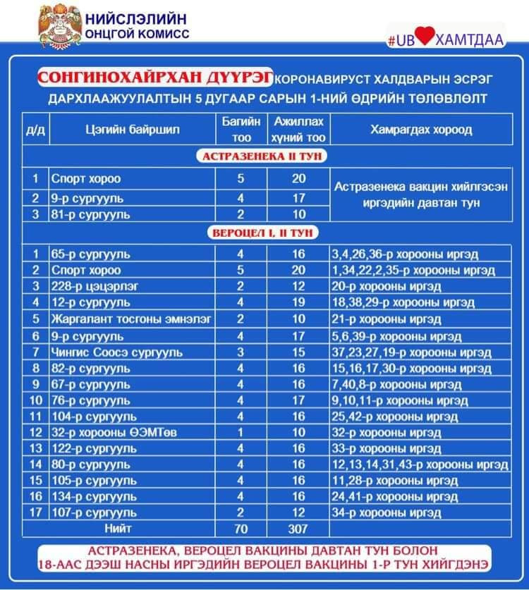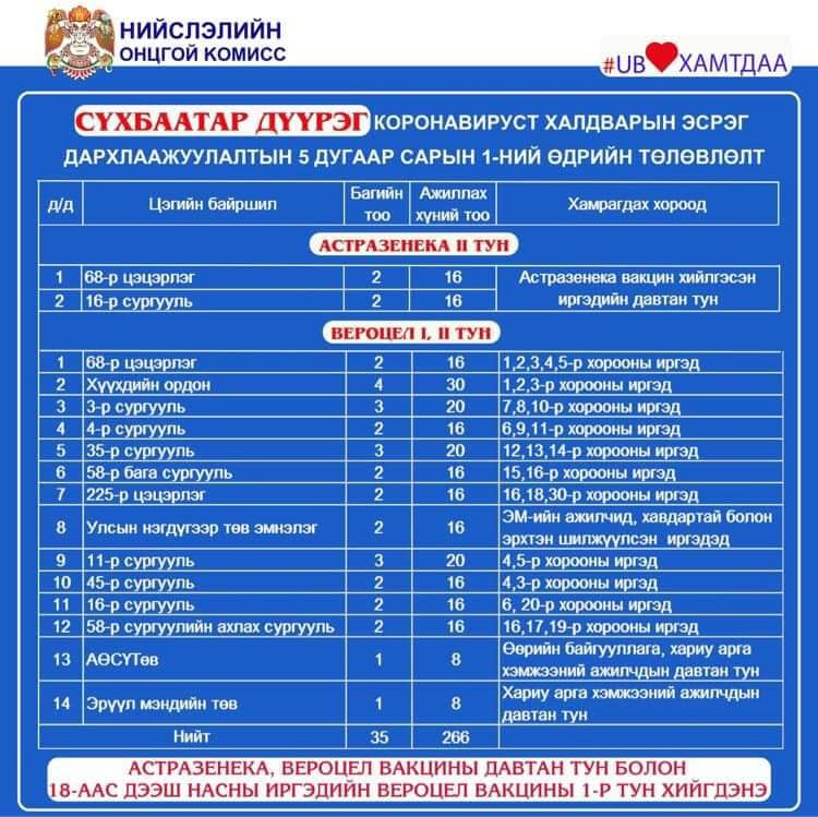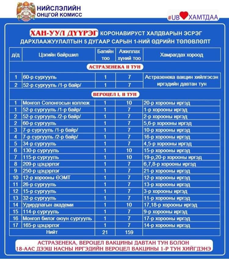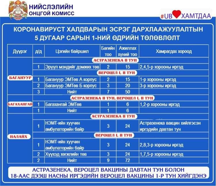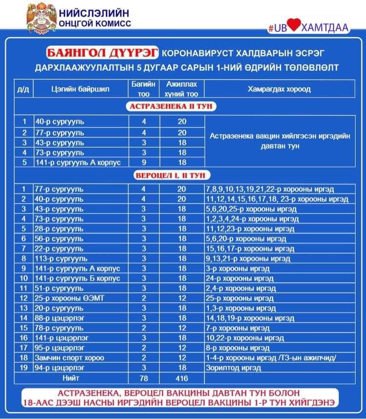 Өнөөдөр Улаанбаатар хотод 110 цэгт 293 багийн 2643 эмч, ажилтан ажиллаж, 76811 иргэнийг дархлаажуулалт хийхээр төлөвлөжээ. Өчигдрийн байдлаар 845693 хүн буюу төлөвлөсөн иргэдийн 40.9 хувийг дархлаажуултын эхний тунд хамруулсан байна. Үүнээс 362926 иргэн коронавирусийн эсрэг вакцины хоёр дахь тунг хийлгээд байна.