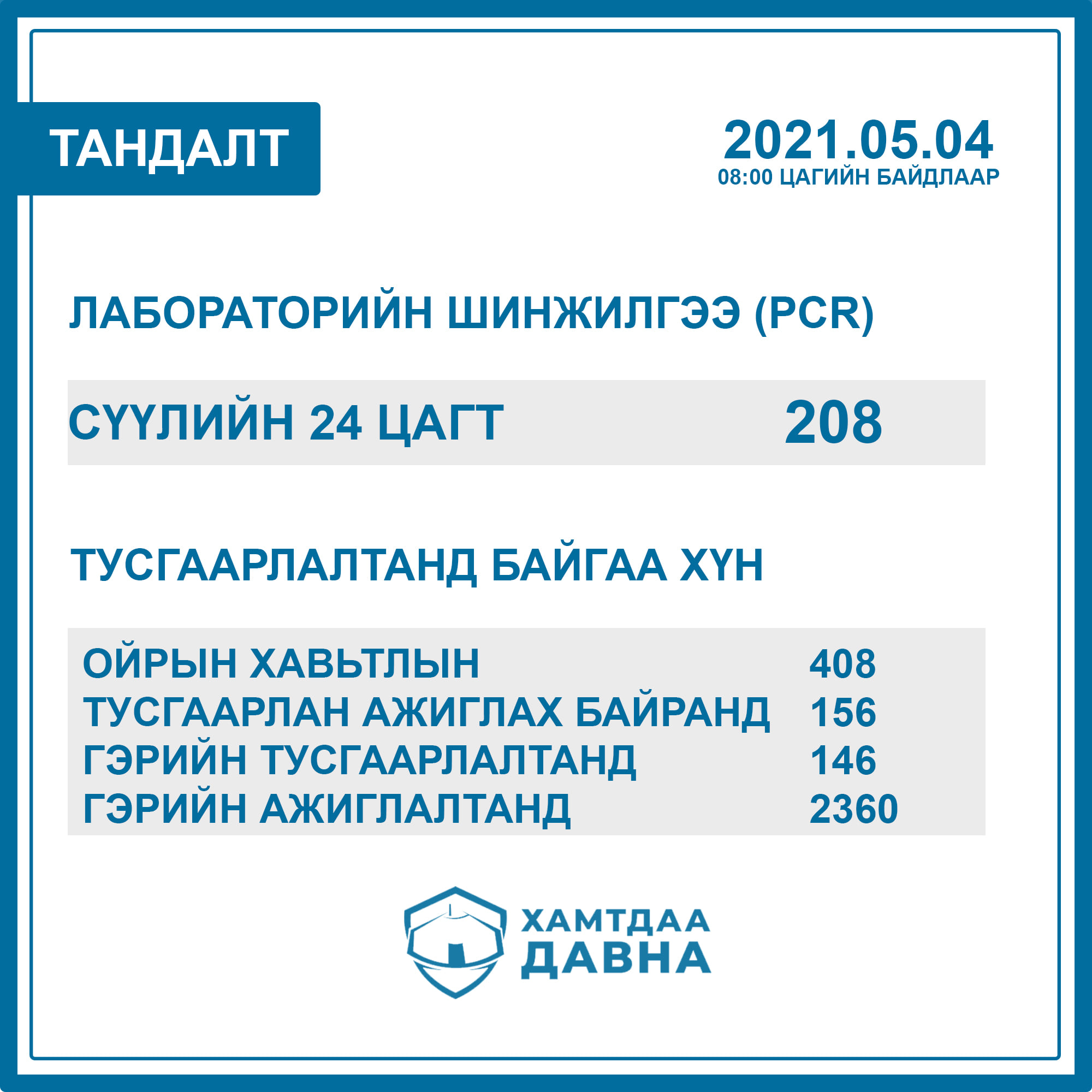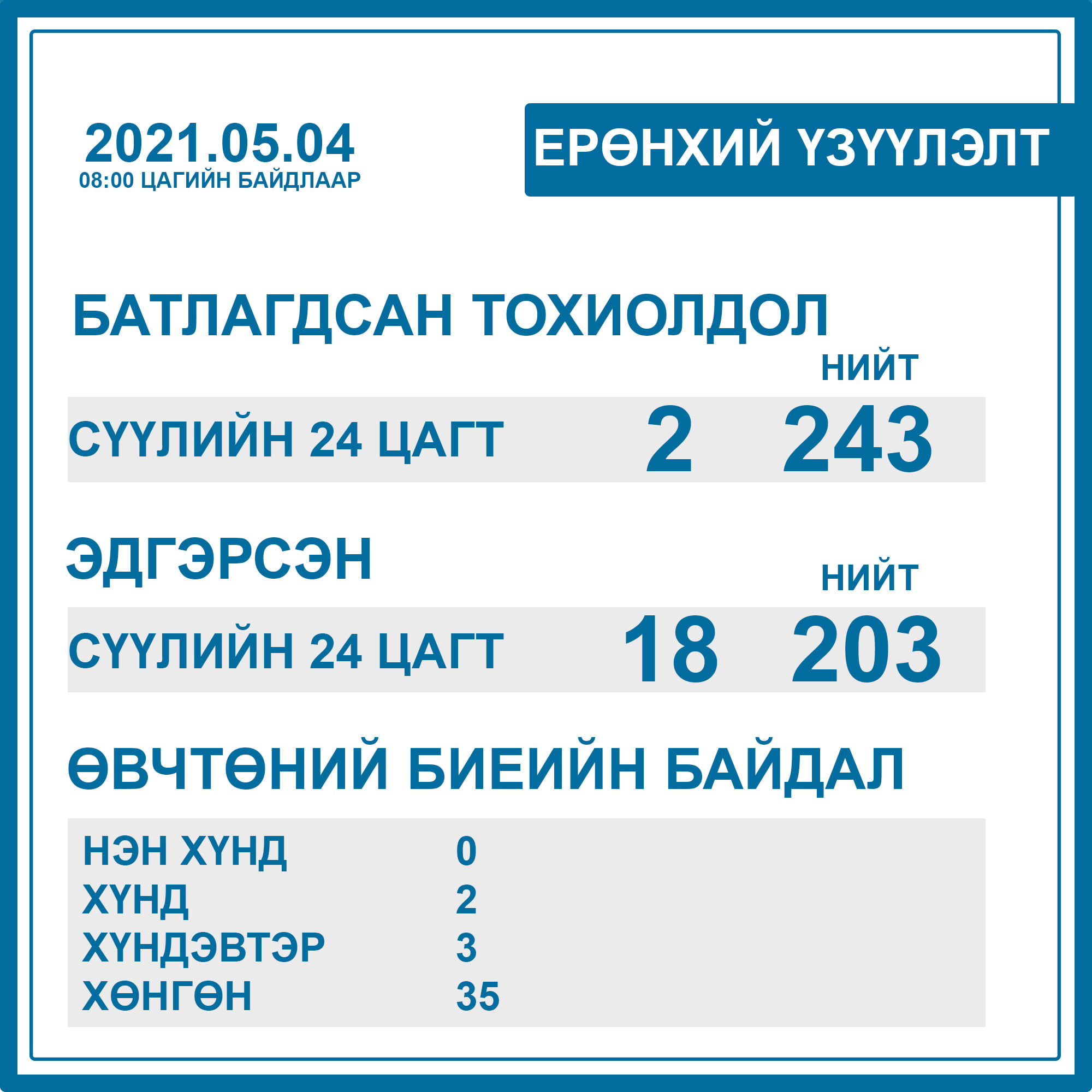 Тодруулбал, Бүсийн оношилгоо эмчилгээний төвийн Вируслогийн салбар лабораторид энэ сарын 2-3-ний өдөр нийт 208 сорьцод PCR шинжилгээ хийхэд хоёр иргэнээс коронавирус илэрсэн байна. Тухайн иргэд халдвартай иргэний ойрын хавьтал болсон тул тусгаарлан ажиглах байранд тусгаарлагдаж байжээ. Өнөөдрийн байдлаар тус аймагт ойрын хавьтал 408 иргэн тусгаарлагдаж байгаа аж. Харин сүүлийн 24 цагийн хугацаанд халдварын улмаас хэвтэн эмчлүүлж байсан 18 иргэн бүрэн эдгэрч, эмнэлгээс гарчээ.