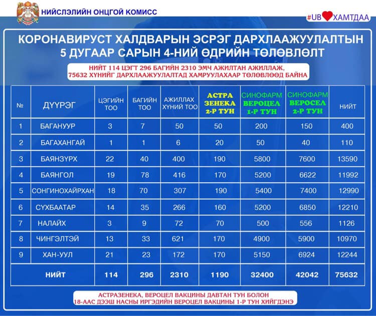 Нийслэлд өнөөдөр вакцинжуулалтын 114 цэг ажиллах бөгөөд 296 багийн 2310 эмч, эмнэлгийн ажилтан 75632 хүнийг дархлаажуулахаар төлөвлөжээ. Тодруулбал, Синофарм эмийн үйлдвэрийн Вероселл вакцины эхний тунг 32400, хоёрдугаар тунг 42042 хүн тус тус тариулах бол АстраЗенека вакцины хоёрдугаар тунд 1190 хүн хамрагдах тооцоо гарсан байна. Өчигдрийн тухайд нийслэлийн хэмжээнд нийт 62019 хүнийг дархлаажуулсан юм.