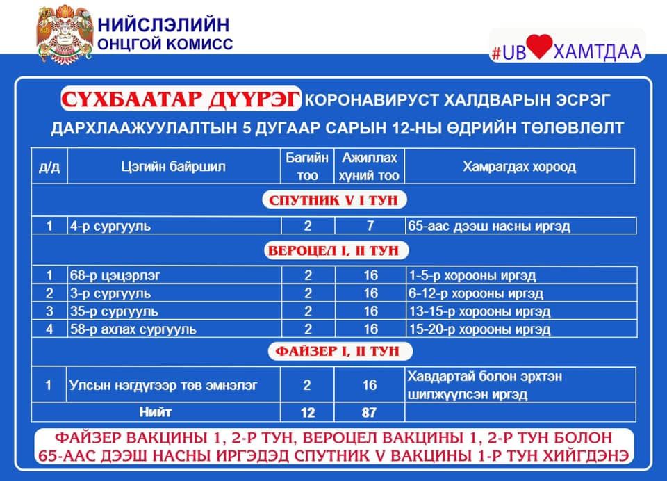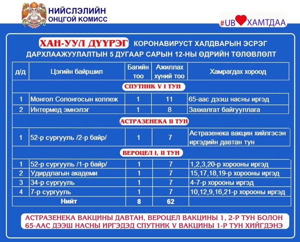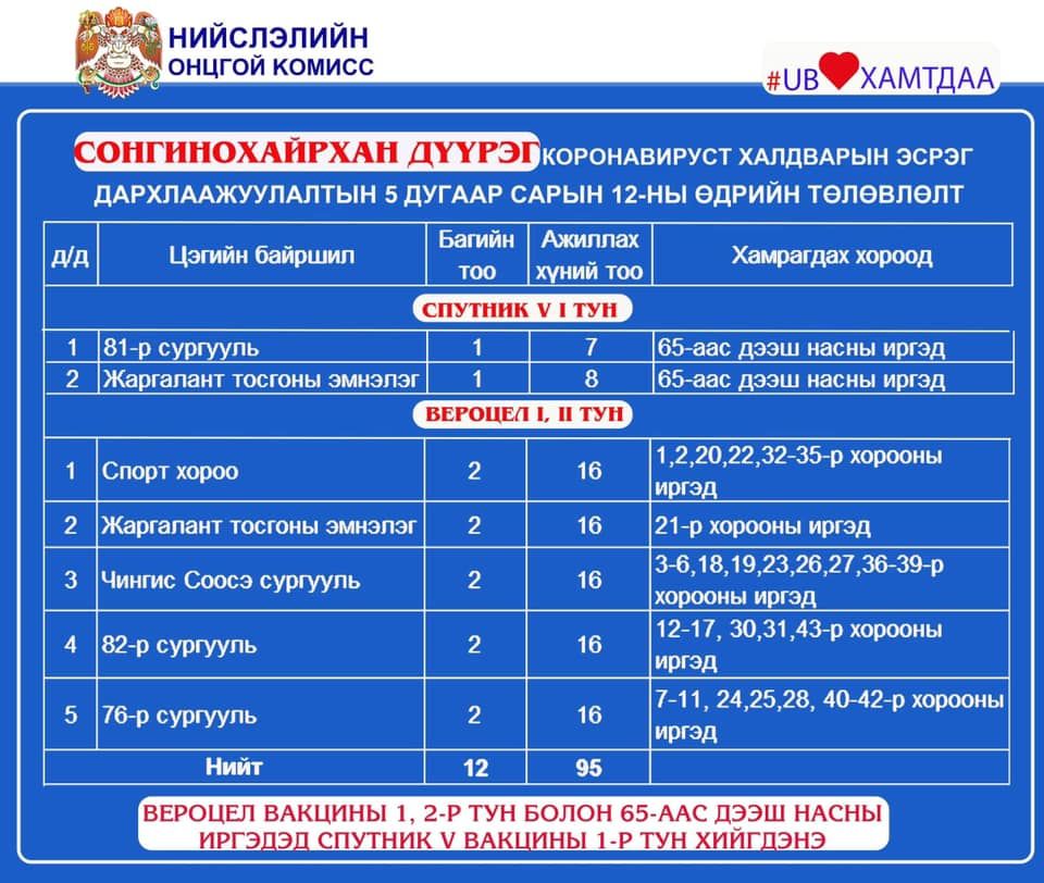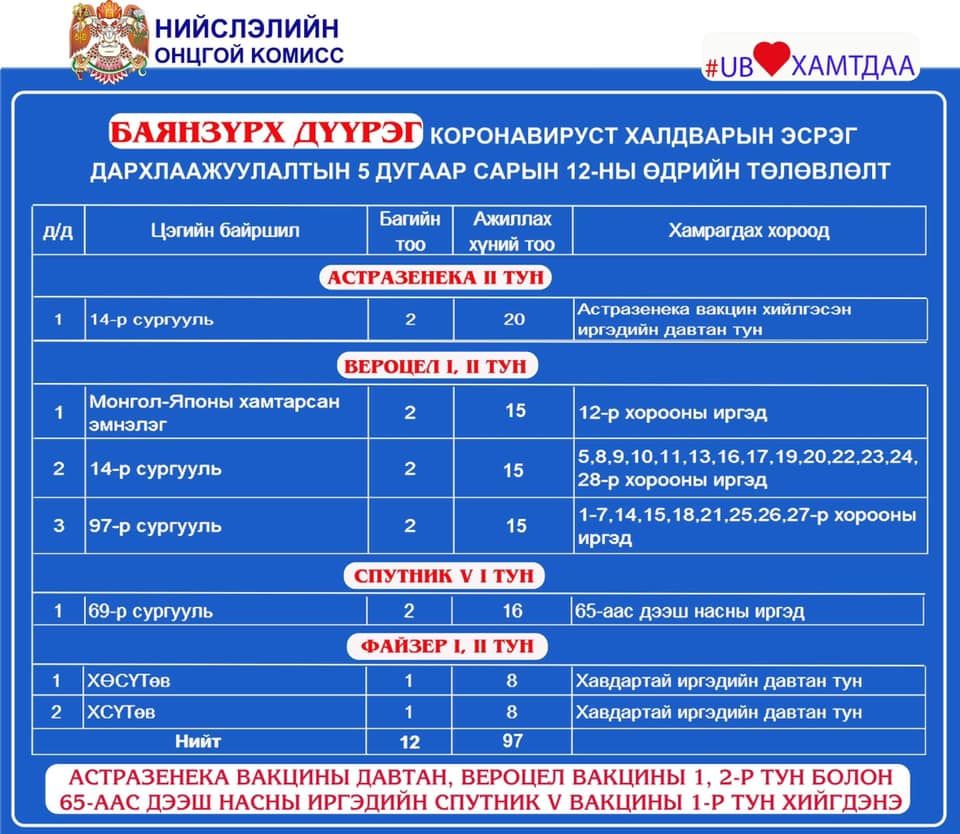 Улаанбаатар хотод өнөөдөр буюу тавдугаар сарын 12-нд дархлаажуулалтын суурин 42, явуулын найман цэг ажиллаж, 10 мянга 358 хүнийг вакцинжуулахаар төлөвлөжээ. Дархлаажуулалтын цэгүүд 09:00 цагаас 18:00 цагийн хороонд ажиллах юм. Өчигдөр буюу тавдугаар сарын 11-нд нийслэлийн хэмжээнд вакцины I тунд 3794, II тунд 1627 нийт 5421 иргэнийг дархлаажуулалтад хамруулсан билээ.