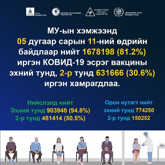 Манай улсад коронавирусийн эсрэг вакцинжуулалт өнгөрсөн хоёрдугаар сарын 24-нд албан ёсоор эхэлсэн билээ. Тэгвэл өчигдөр буюу тавдугаар сарын 11-ний байдлаар улсын хэмжээнд нийт хүн амын 81.2 хувь буюу 1.6 сая иргэн вакцины эхний тундаа хамрагджээ. Харин вакцины хоёрдугаар тунд 631666 иргэн буюу нийт хүн амын 30.6 хувь нь хамрагдсан байна.
