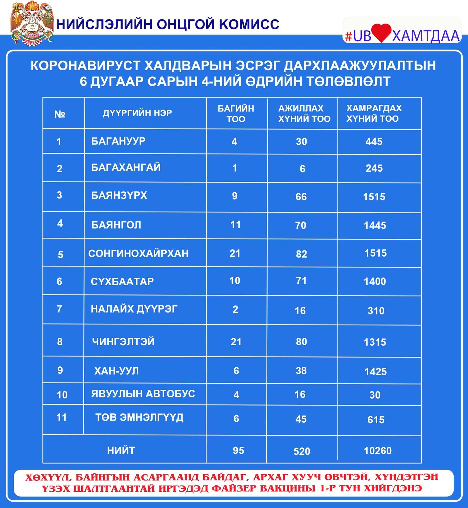 Нийслэлд өнөөдөр буюу зургаадугаар сарын 4-нд явуулын дөрөв, суурин 41 цэгт 95 багийн 520 эмч, ажилтан ажиллаж, 10260 иргэнийг дархлаажуулахаар төлөвлөжээ.