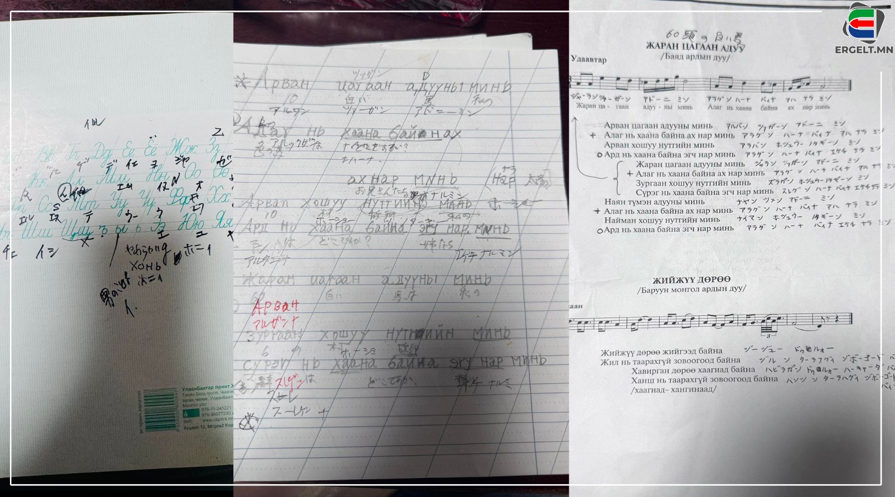 Тэрбээр “Жаран цагаан хонь” дууг сурахын тулд цагаан толгойн үсэгтэй элемент дэвтэр Монголоос захиж авчраад, түүн дээрээ крилл үсгийг чадах чинээгээрээ дуурайлган бичжээ.